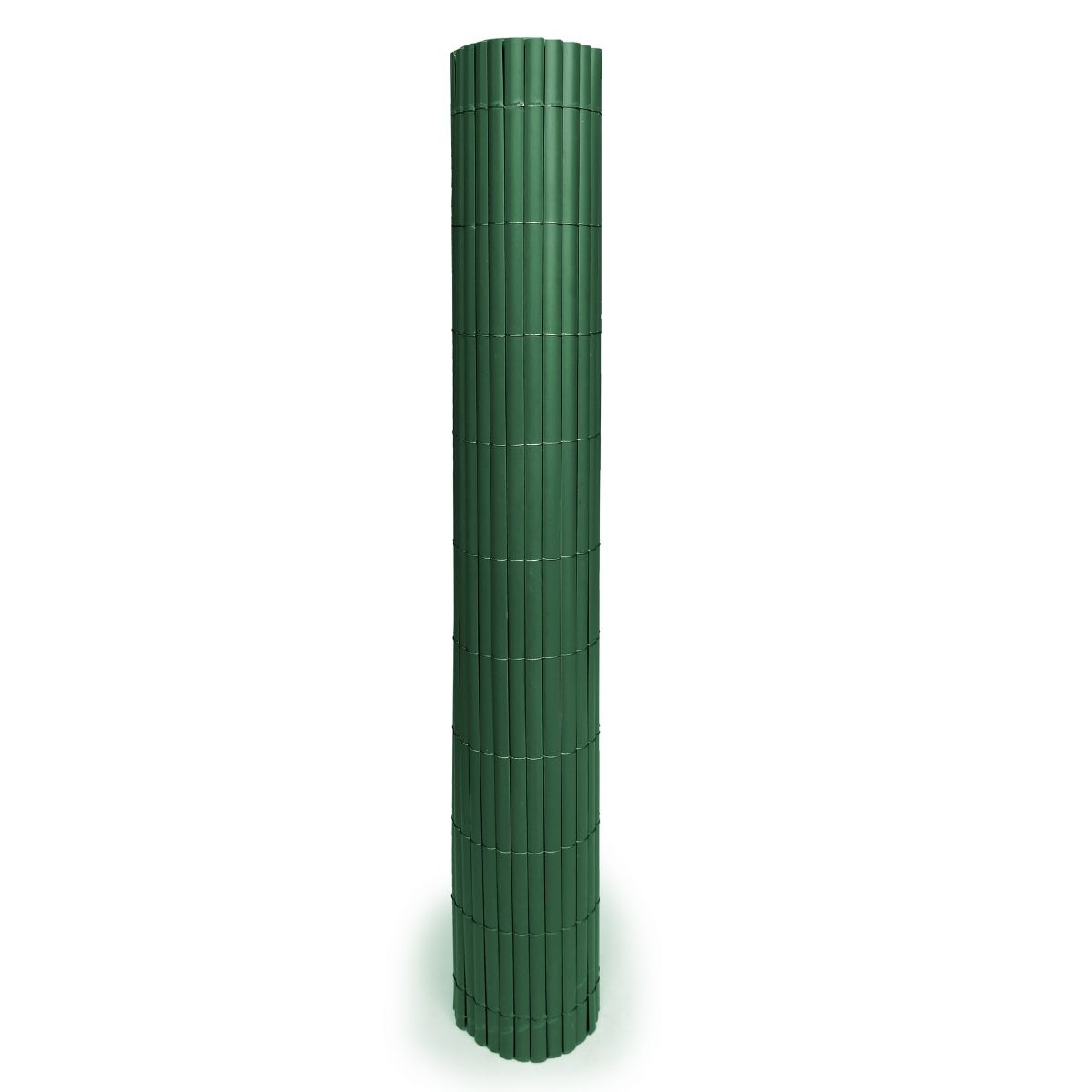 Single-sided PVC reed fencing. Nylon thread weave, in the same color as the product, every 10 cm, glued to the slats. Colors: green, camel, white, taupe, and gray. Density: 0.9 kg/m². 50% recycled content.